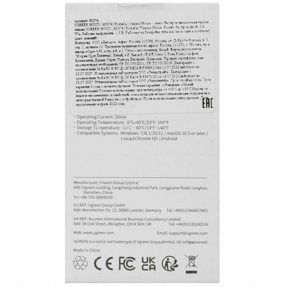 Беспроводная компьютерная мышь UGREEN MU001 (90531) Portable Wireless Mouse. Цвет: черный
