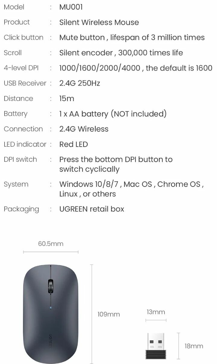 Мышь беспроводная UGREEN MU001, 4000 dpi, USB/Радиоканал, серый (90373)