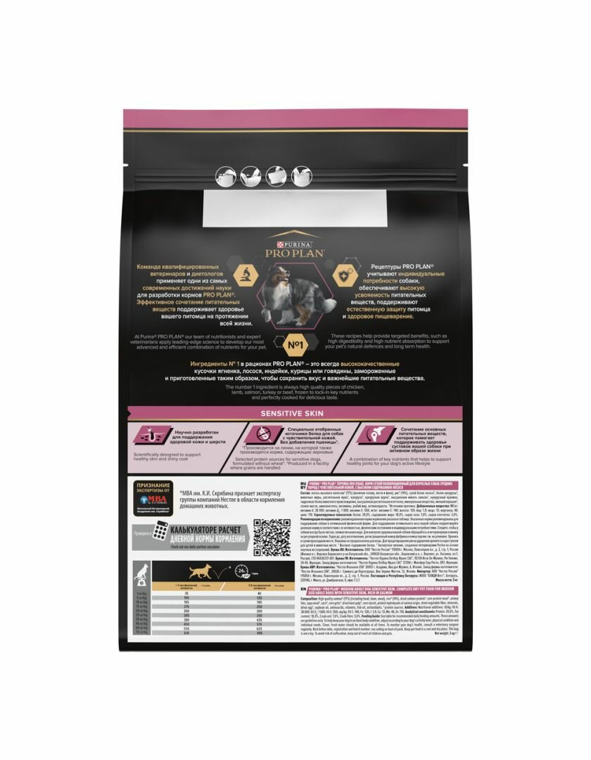 Сухой корм Pro Plan для взрослых собак средних пород с чувствительной кожей, с высоким содержанием лосося 3 кг