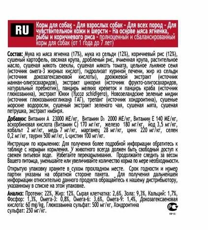 | Состав | мука из мяса ягненка, мука из мяса сельди, коричневый рис, картофельная мука, перловая крупа, дробленый рис, овсяная крупа, растительное масло, смесь токоферолов, сушеная мякоть свеклы, сушеная мякоть томата, измельченная клетчатка, цельное семя льна, лецитин, гидролизат куриной печени, жир сельди, мононатрийфосфат, холинхлорид, кальция пропинат, дрожжевой экстракт, аскорбиновая кислота, таурин, экстракт цикория, сульфат железа, сульфат глюкозамина, оксид цинка, ацетат ɑ-токоферола, хондроитин сульфа, экстракт Юкки Шидигера, протеинат железа, протеинат цинка, селенит натрия, мононитрат тиамина, сушеные водоросли, экстракт зеленого чая, сушеная мята, сушеная петрушка, L-цистин, сульфат меди, йодат кальция, пиридоксина гидрохлорид, оксид марганца, протеинат марганца, экстракт имбиря, никотиновая кислота, d-пантотенат кальция, супплемент витамина A, протеинат меди, холикальцеферол, фолиевая кислота, рибофлавин, бисульфат менадиона никотинамида, биотин, супплемент витамина В12, карбонат кобальта |
