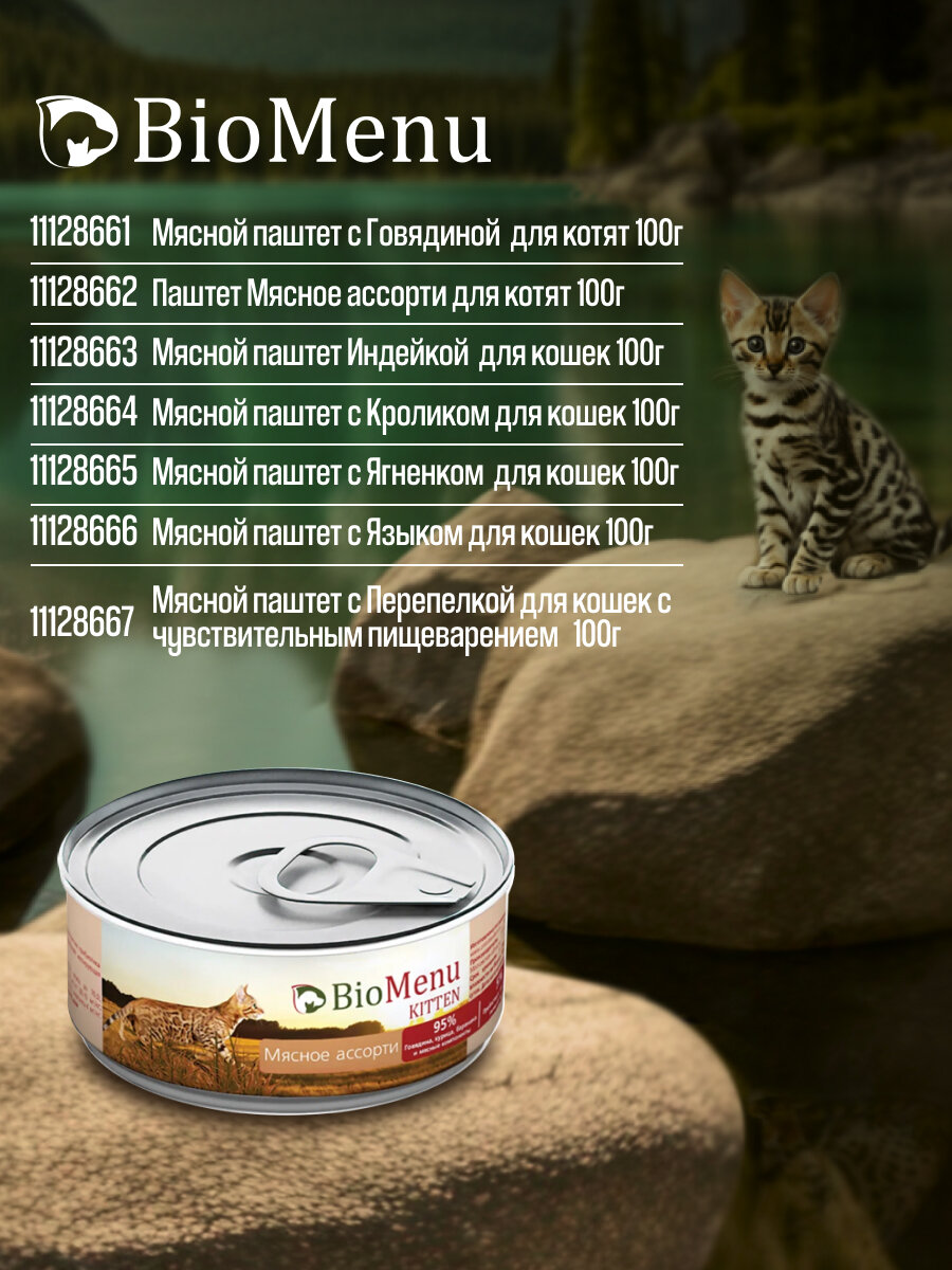 Консервы для котят BioMenu Kitten, мясной паштет 95% - мясо, мясное ассорти 100 г