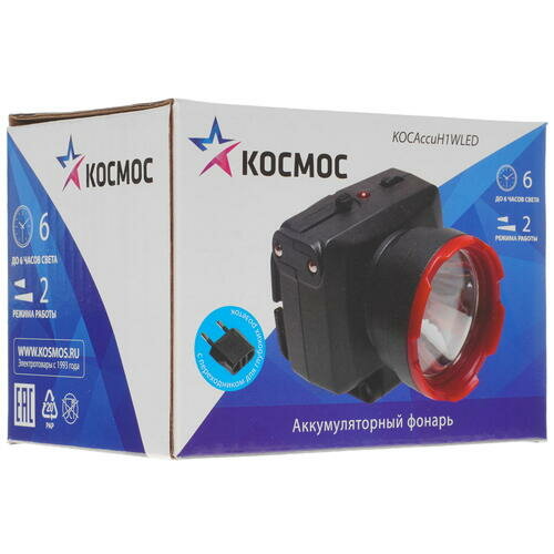 Космос Фонарь аккумуляторный налобный H1W LED 1Вт 2 режима аккум. 0.5А.ч ЗУ 220В космос KOCAccuH1WLED