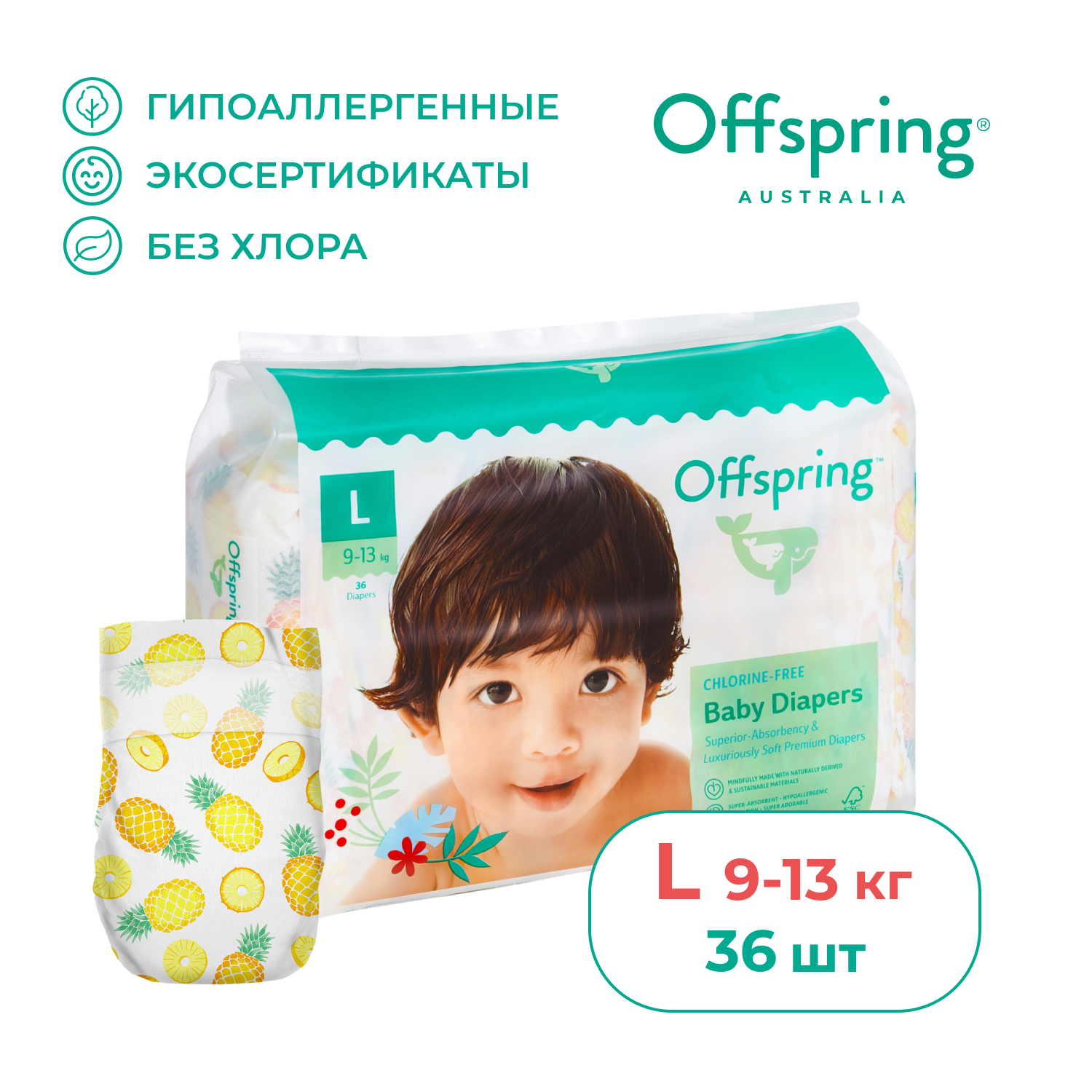 Offspring подгузники, L 9-13 кг. 36 шт. расцветка Ананасы, OF01L36PHP