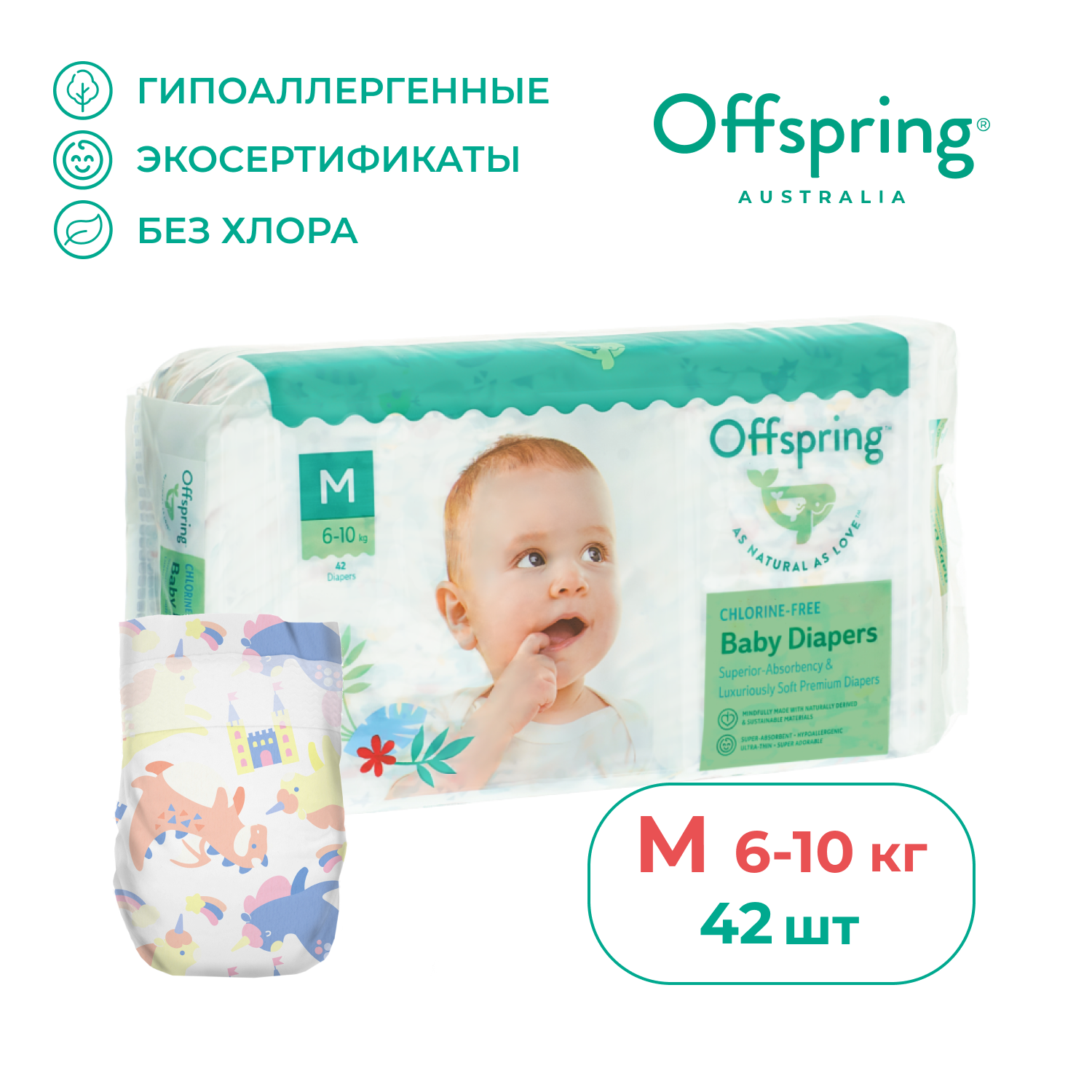 Подгузники Offspring Расцветка Единороги M (6-10 кг.), 42 шт.