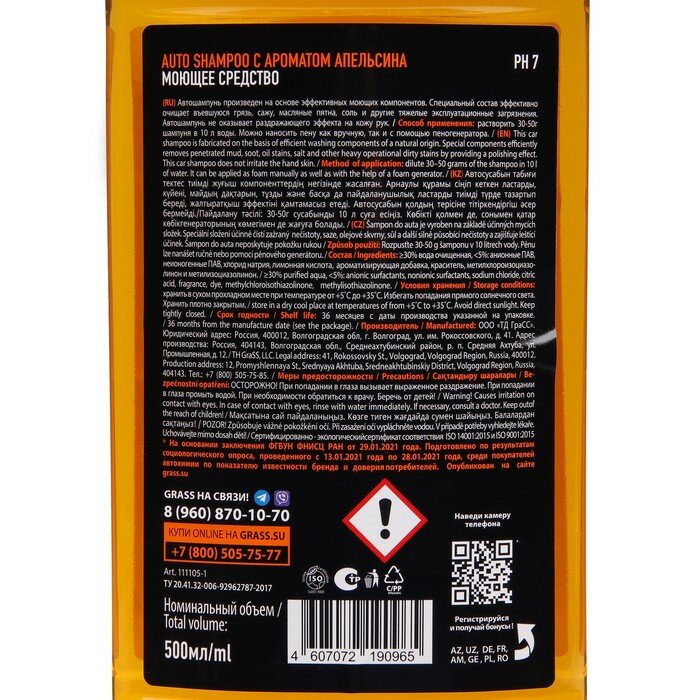 1111051_автошампунь! ’Auto Shampoo’ с ароматом апельсина (флакон 500 мл)\ GRASS 1111051