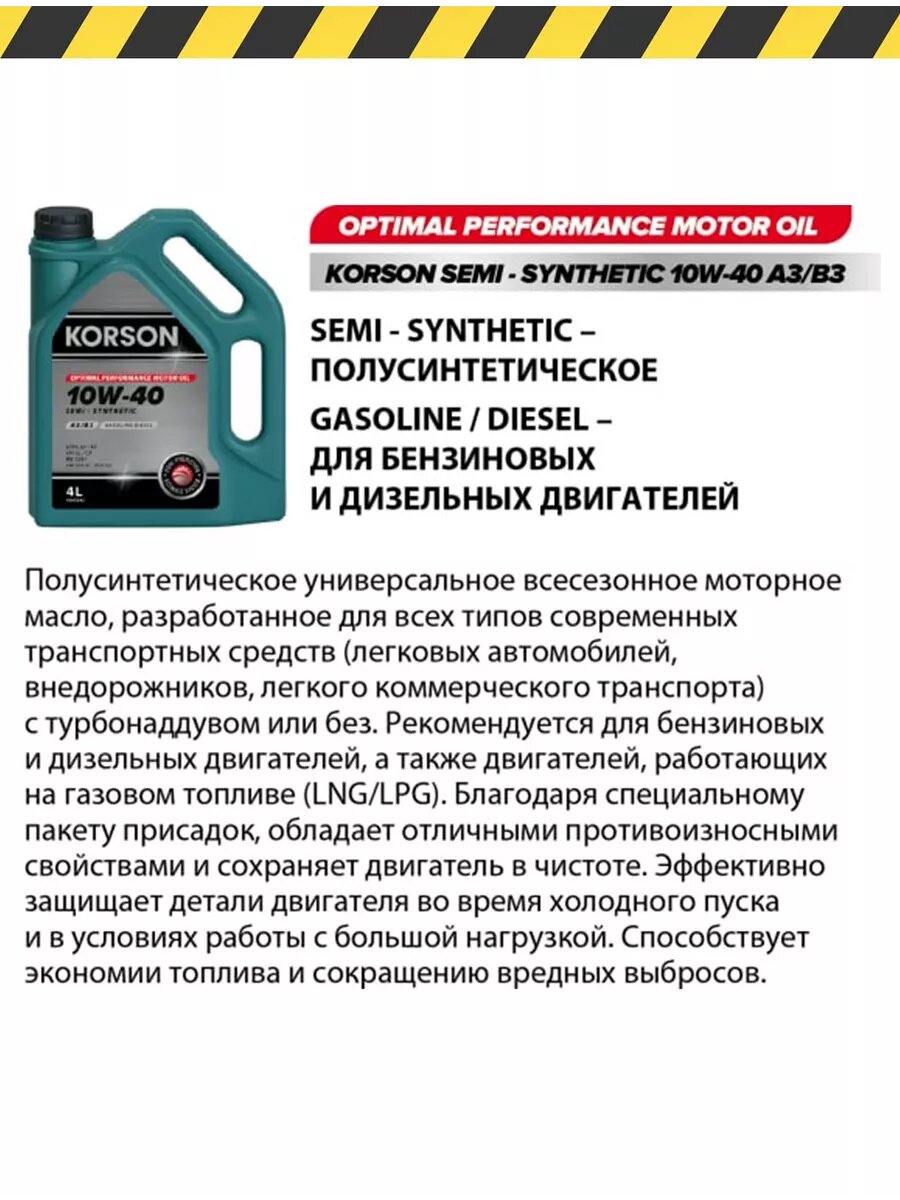 Сохранить10W-40 SEMI-SYNTHETIC A3 B4 4л (полусинт. мотор. масло) KORSON KS00042 интересное:
