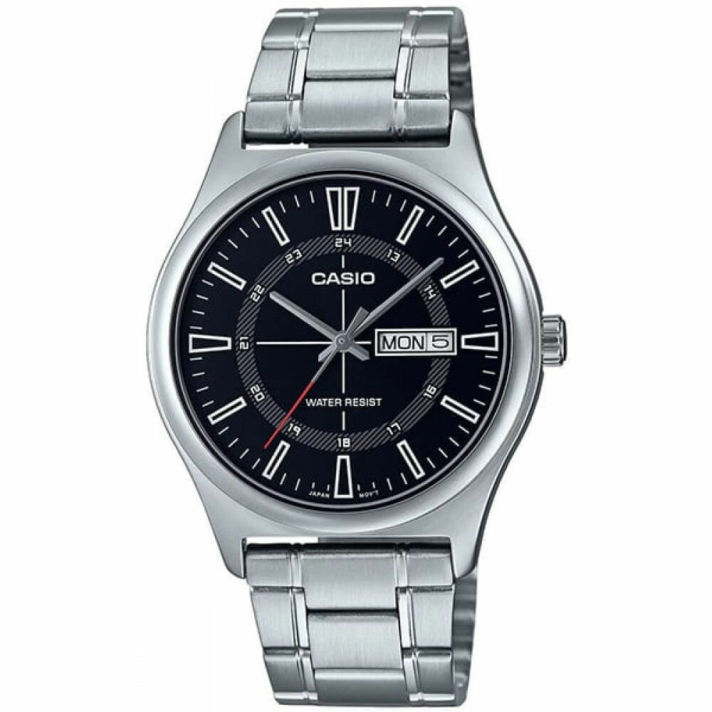 MTP-V006L-7B Casio наручные часы кварцевые WR30 (3 атм) мужские хром, черный отображение числа, отображение дня недели минеральное стекло