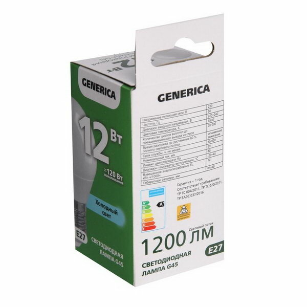 GENERICA шар G45 E27 12W(1200lm) 3000K 2K 45x81 матов. LL-G45-12-230-30-E27-G (арт. 827995)