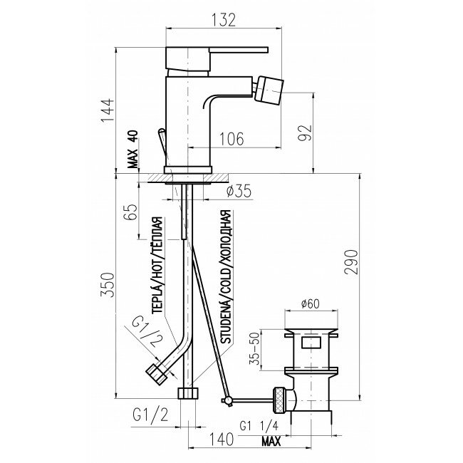 ZA045.5 ZAMBEZI - смеситель для биде, донный клапан (пластик) RAV Slezak