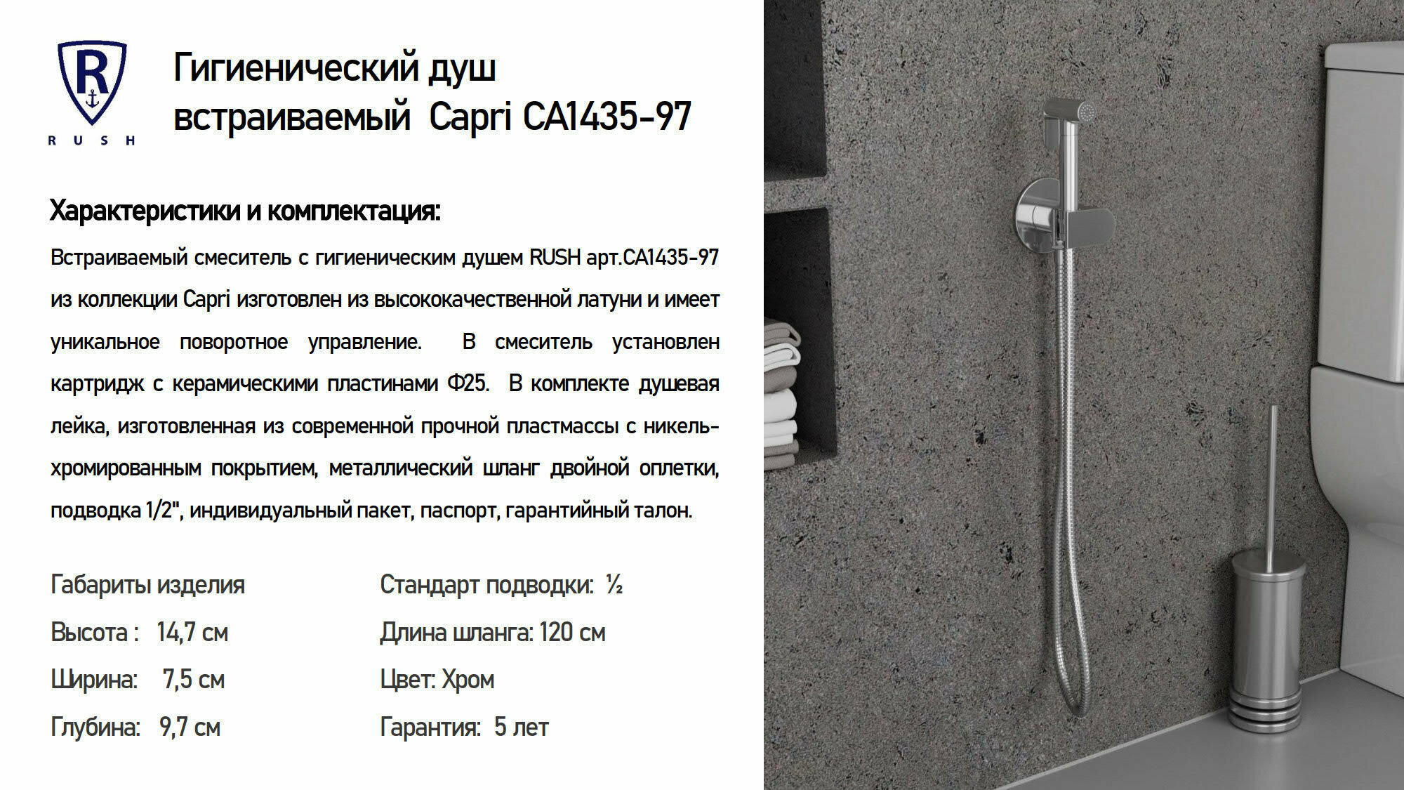 Ниже Вы можете прочитать отзывы на Гигиенический душ со смесителем Rush Capri CA1435-97, встраиваемый, хром, ознакомится с подробными характеристиками, посмотреть интересные обзоры и фотографии на Гигиенический душ со смесителем Rush Capri CA1435-97, встраиваемый, хром.