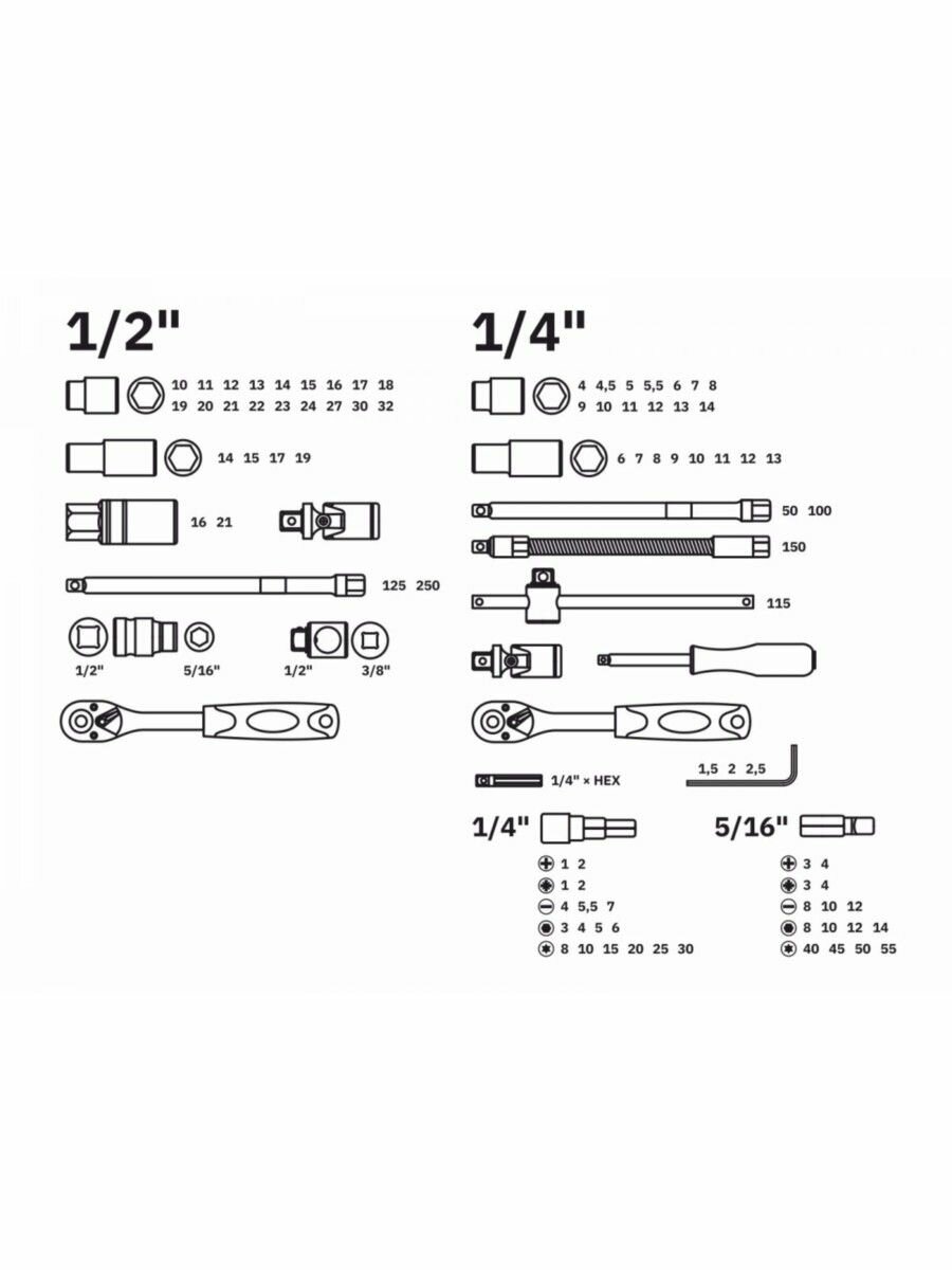 | Головки торцевые подробно | 1/4": 4, 4.5, 5, 5.5, 6, 7, 8, 9, 10, 11, 12, 13, 14 мм; длинная 1/4": 6, 7, 8, 9, 10, 11, 12, 13 мм; HEX 1/4": H3, H4, H5, H6; TORX 1/4": T8, T10, T15, T20, T25, T30; SL 1/4": SL4, SL5.5, SL7; PH 1/4": PH1, PH2; PZ 1/4": PZ1, PZ2; 1/2": 10, 11, 12, 13, 14, 15, 16, 17, 18, 19, 20, 21, 22, 23, 24, 27, 30, 32 мм; длинная 1/2": 14, 15, 17, 19, 22 мм |