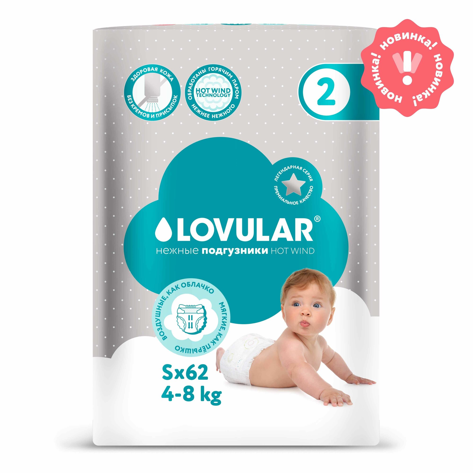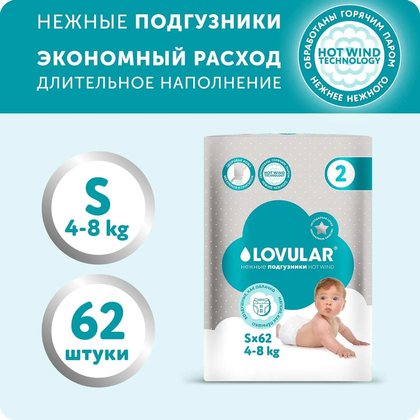 Подгузники Lovular HOT WIND, S 4-8 кг, 62 шт