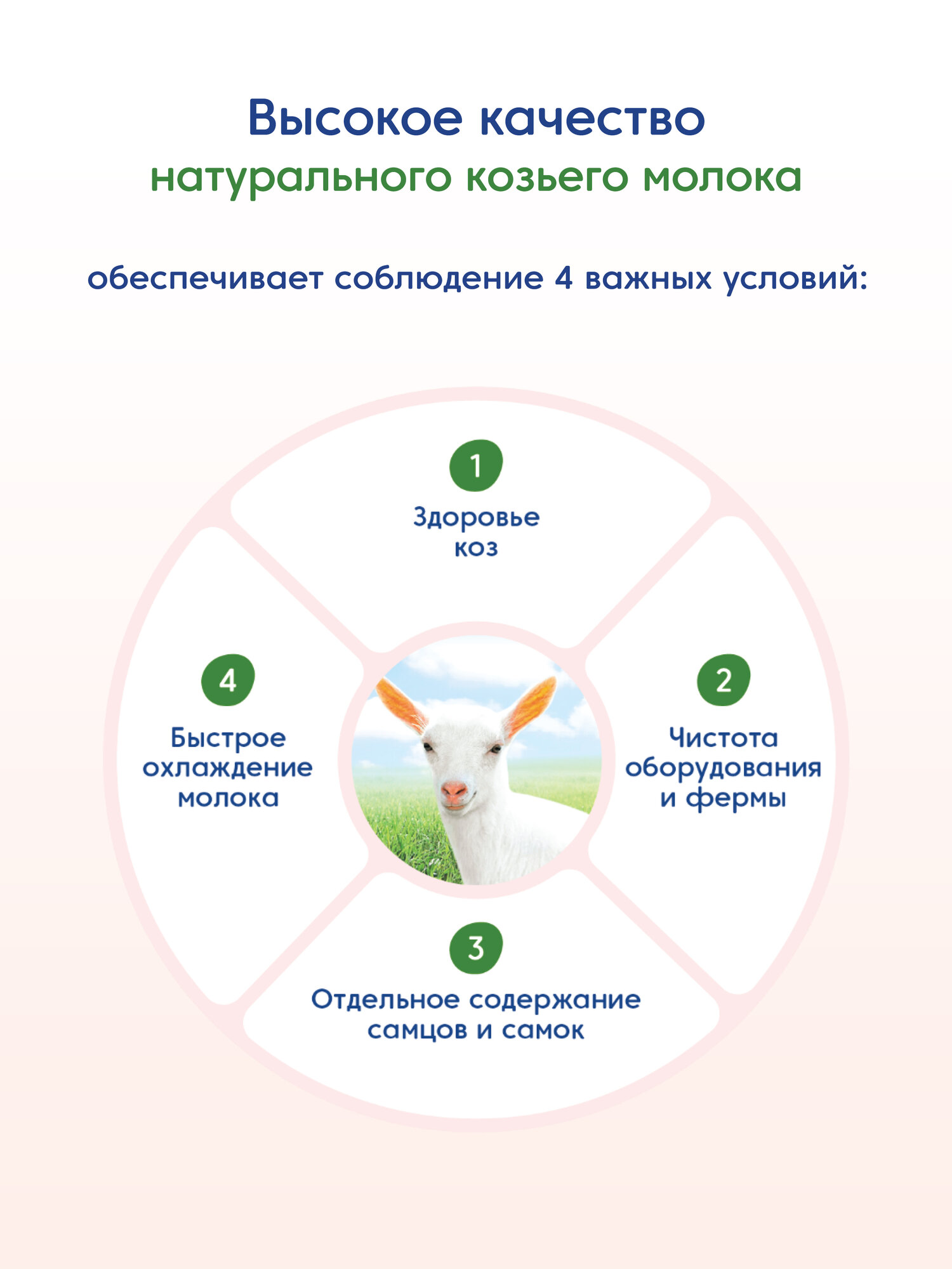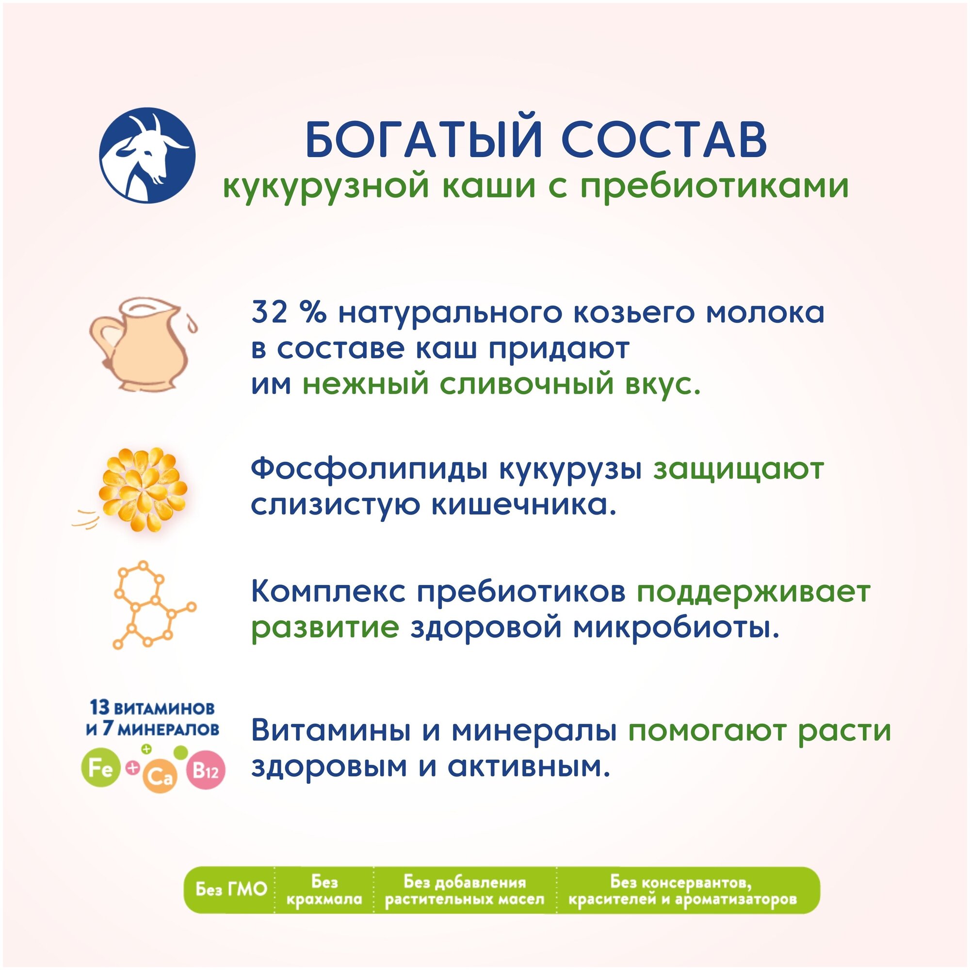 | Состав | кукурузная крупа, козье молоко (32%), пребиотические волокна цикория, минеральная добавка (карбонат кальция, пирофосфат железа (III), йодид калия, сульфат цинка), витамины (A, D, E, K, C, B1, B2, B6, B12, ниацин, фолиевая кислота, пантотеновая кислота, биотин) |