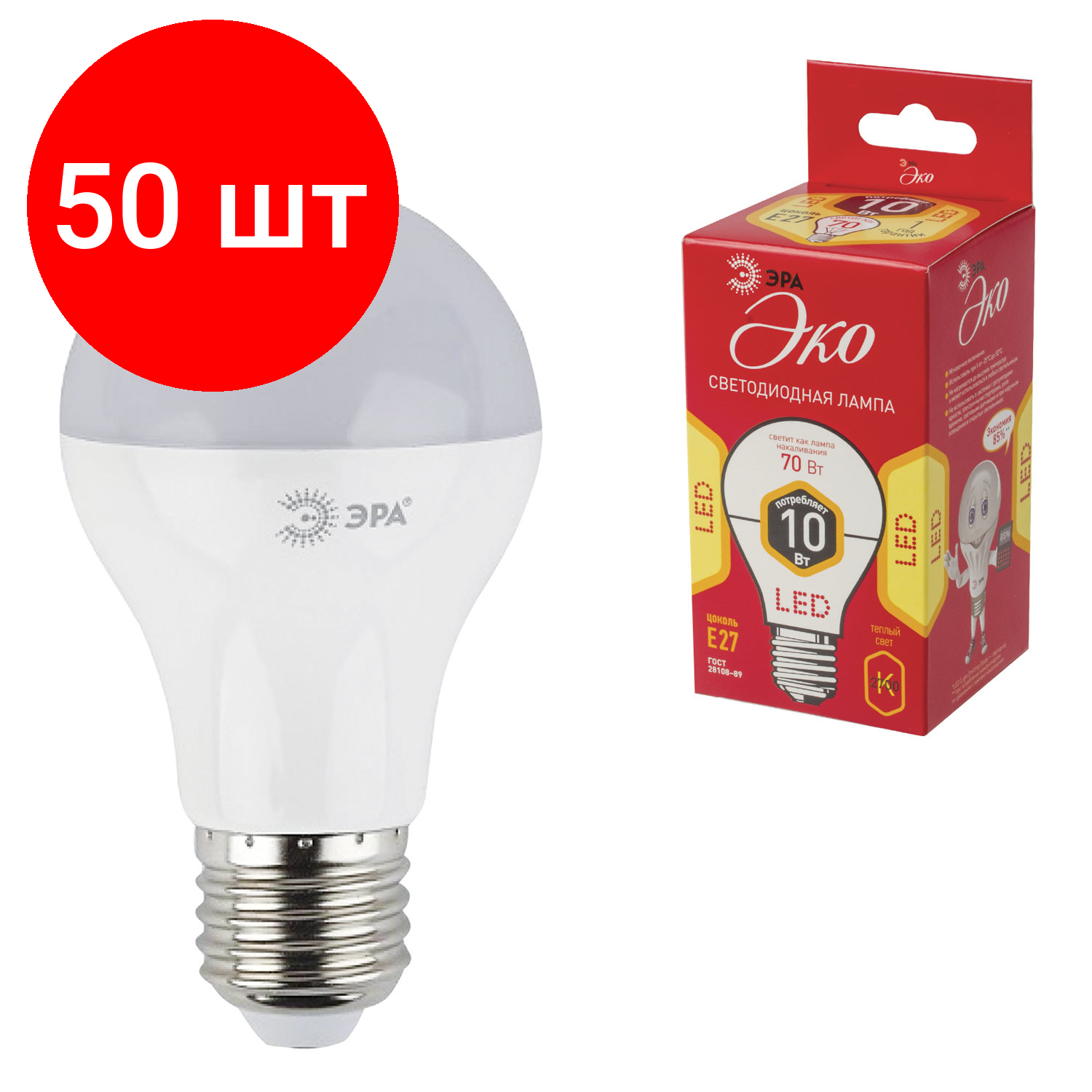Купить Комплект 50 шт, Лампа светодиодная ЭРА, 10 (70) Вт, цоколь E27, грушевидная, теплый белый свет, 25000 ч., LED smdA60-10w-827-E27ECO