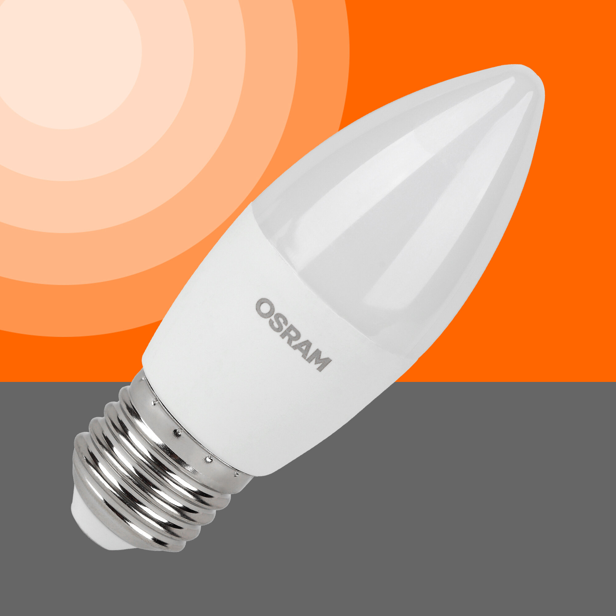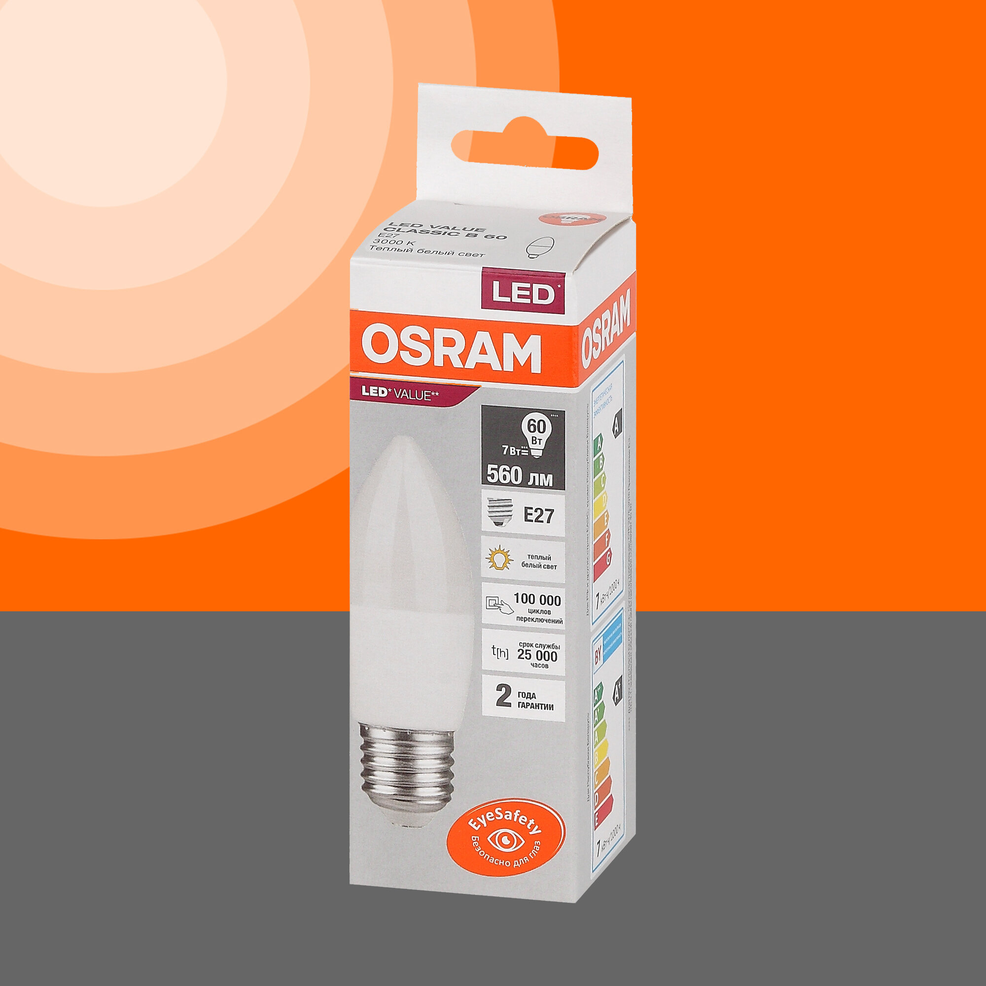 Лампочка светодиодная OSRAM LED Value B, 560лм, 7Вт (замена 60Вт), 3000К (теплый белый свет), Цоколь E27, Свеча, 1 шт