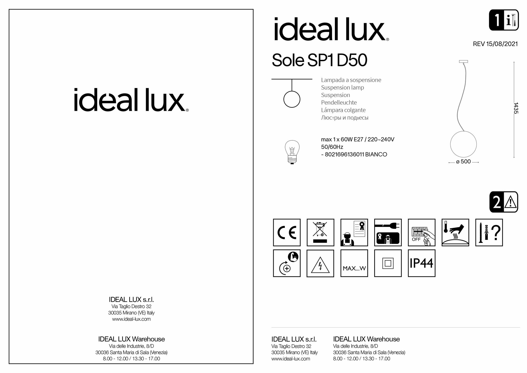 Купить Светильник уличный подвесной ideal lux Sole SP1 D50 макс.1x60Вт IP44 E27 230В Опал Пластик/Алюминий Без ламп 136011.