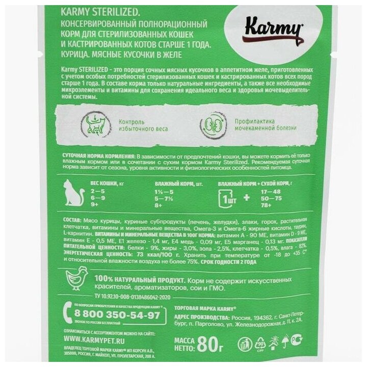 Влажный корм Karmy STERILIZED Курица в желе для стерилизованных кошек и кастрированных котов старше 1 года 12х80г.