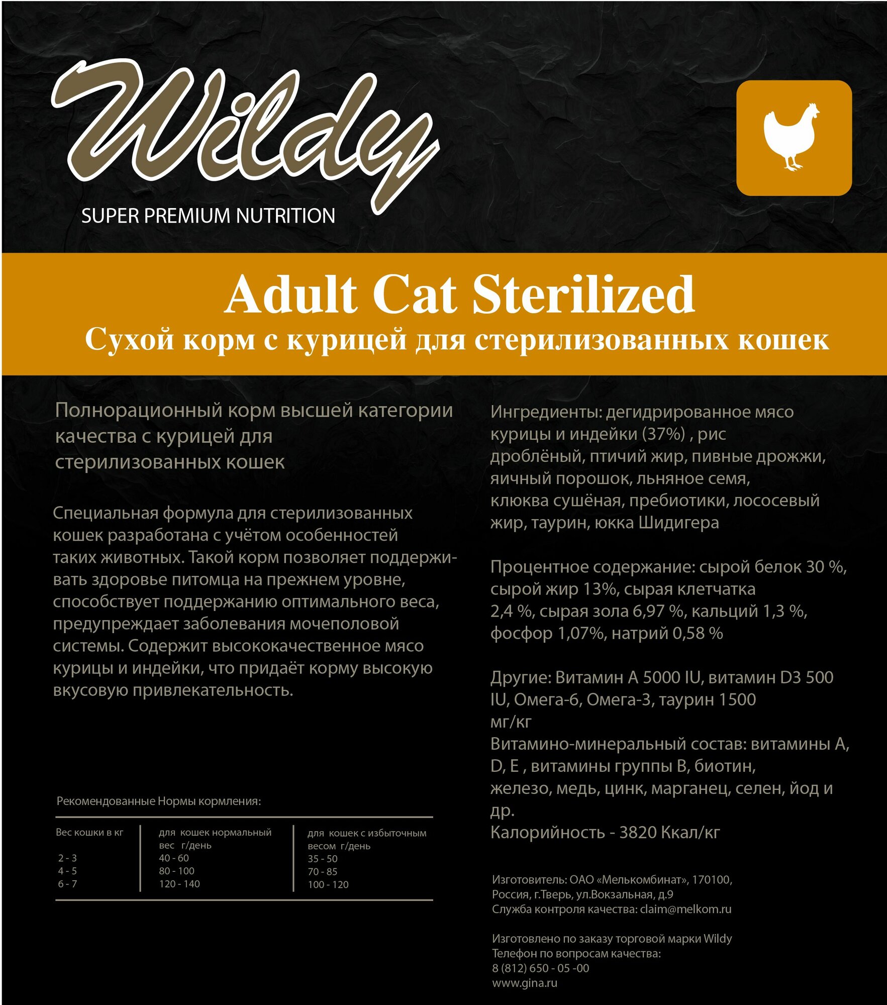 WILDY ADULT CAT STERILIZED для взрослых кастрированных котов и стерилизованных кошек с курицей (1 кг)