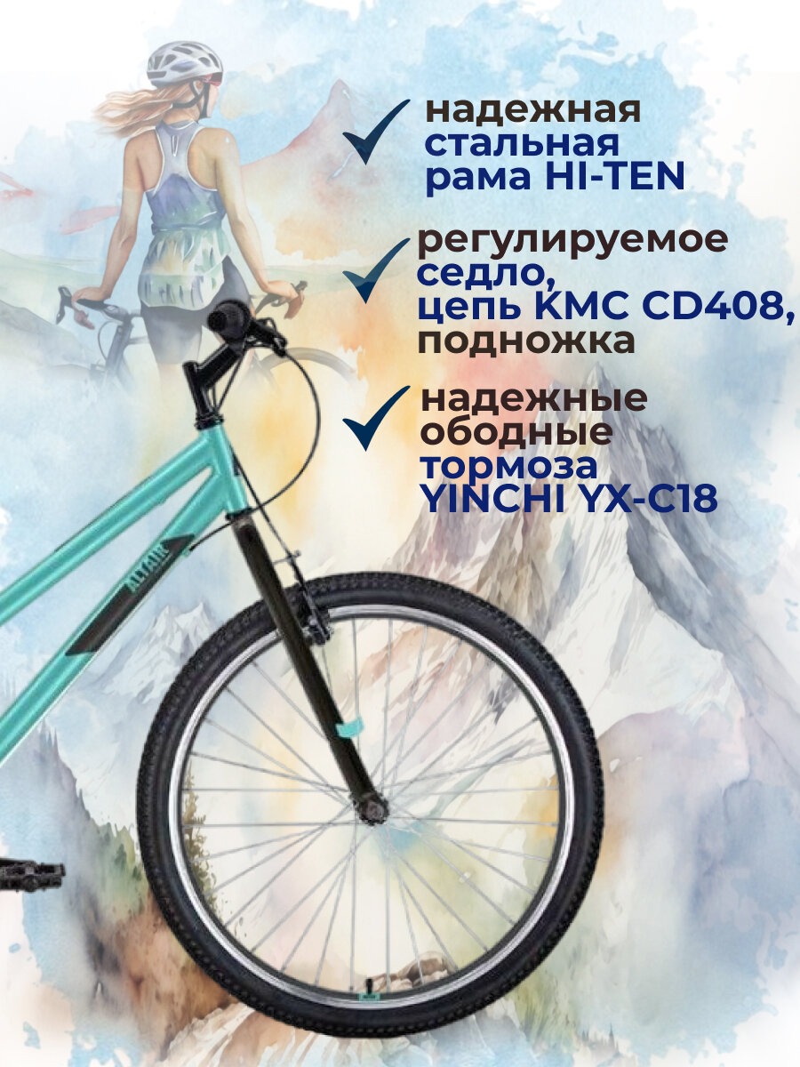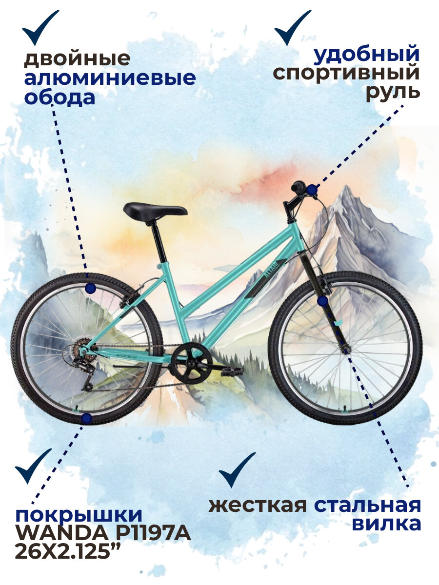 Женский велосипед ALTAIR MTB HT 26 low (26" 6 ск. рост. 15") 2022, мятный/черный, IBK22AL26119