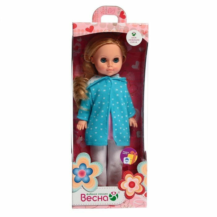 | Комплектация | кукла, вязаное пальто с капюшоном и застежкой сверху, трикотажные брюки, розовая футболка с термоаппликацией "Котенок", трусики, пластмассовые туфельки |
