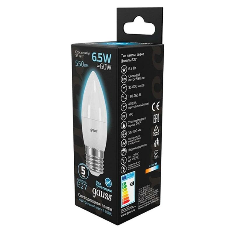 Светодиодная лампа GAUSS 103102207 Е27 6,5W(60W) 4100K AC220-240V свеча