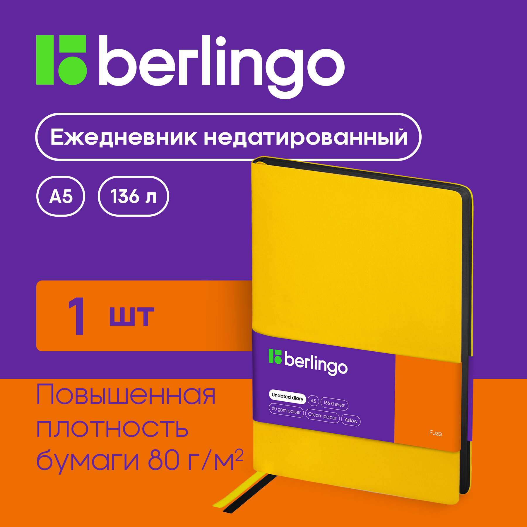 Купить Ежедневник недатированный Berlingo A5, 136 листов, кожзам, "Fuze", цветной срез, желтый (UD0_87509)