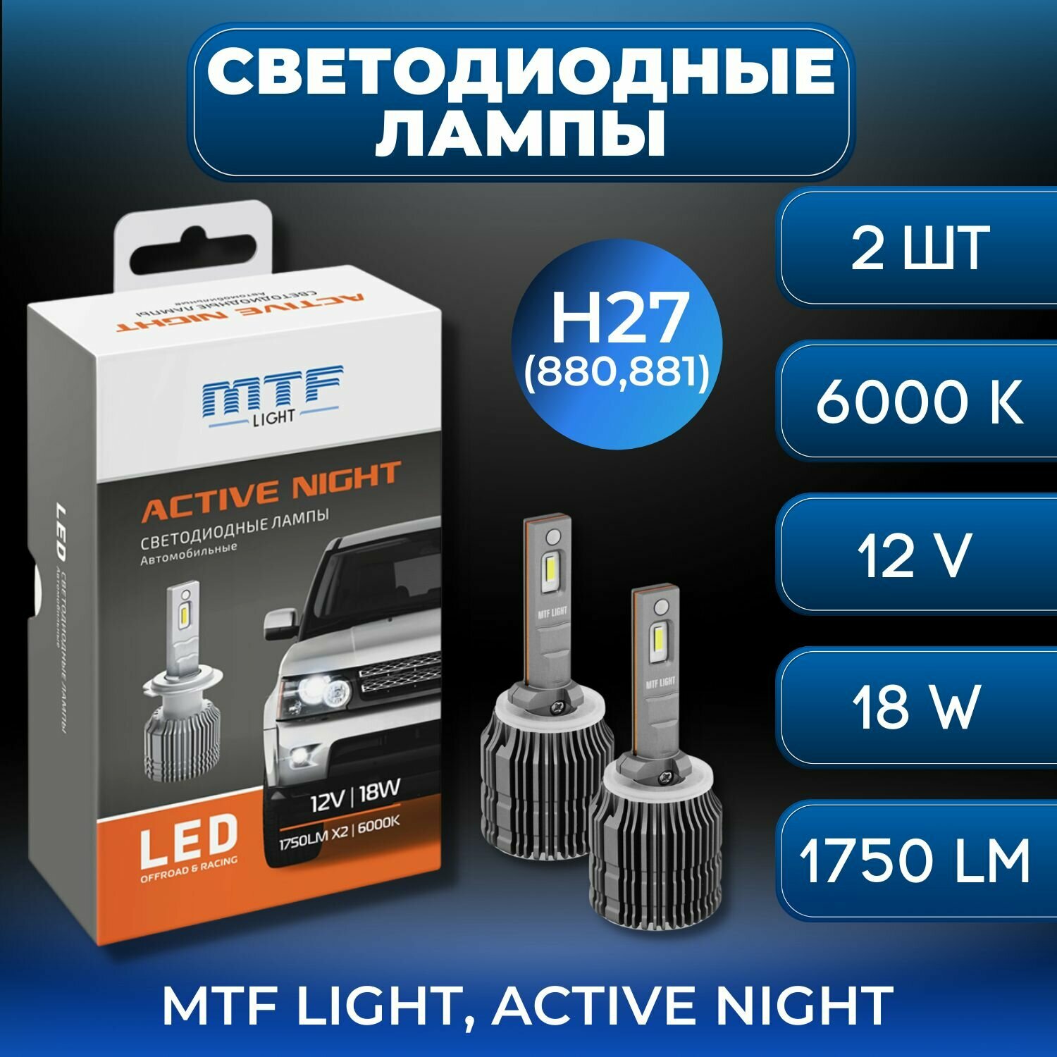 Светодиодные лампы Mtf Light , серия ACTIVE NIGHT, HB4, 18W, 1750lm, 6000K, комплект.