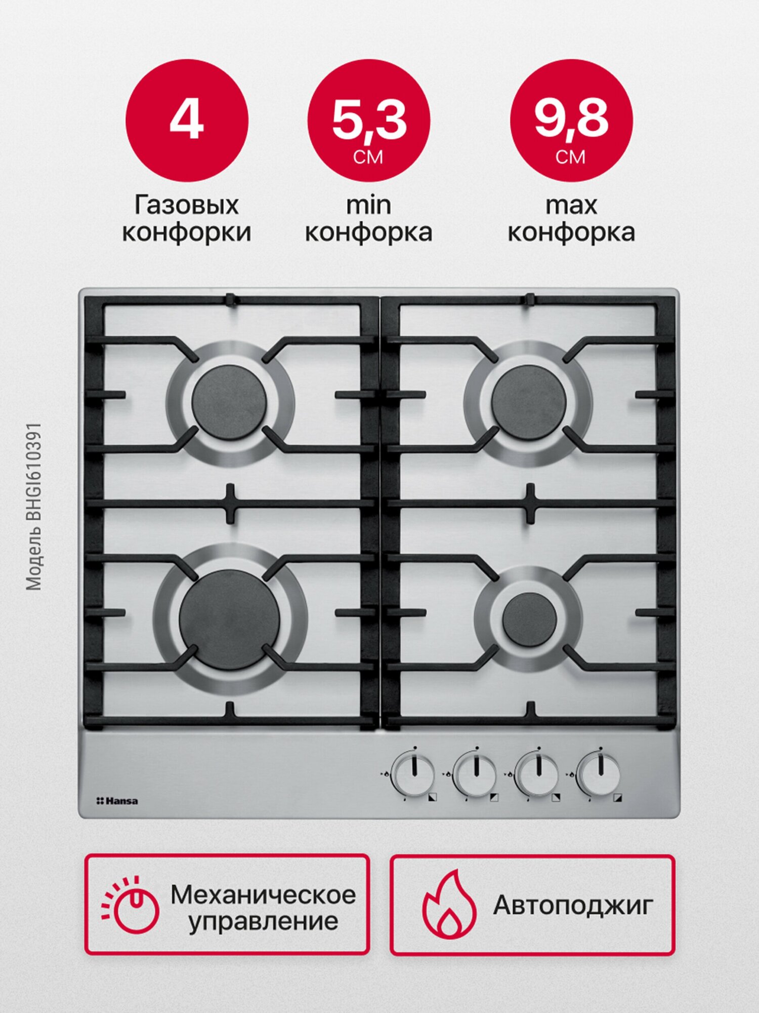 Газовая варочная панель Hansa BHGI610391, встраиваемая, 60 см, газ-контроль и автоподжиг, чугунные решетки, нержавеющая сталь