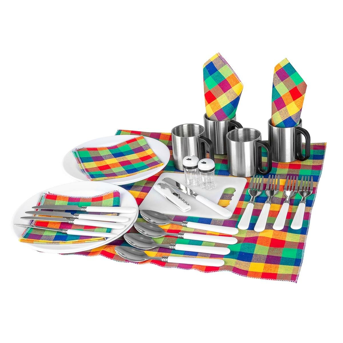 | Комплектация | 4 тарелки 4 кружки из нержавеющей стали 4 ложки 4 вилки 4 ножа 1 разделочный нож 1 штопор-открывашка 1 доска разделочная 1 солонка 1 перечница 1 скатерть 4 салфетки |