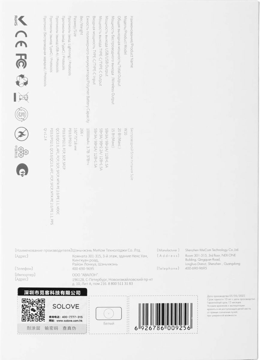 Внешний аккумулятор SOLOVE 10000mAh Magnetic MagSafe 20W QC 3.0 PD 3A USB-A 1 + Type-C 1 W10 White RUS, белый
