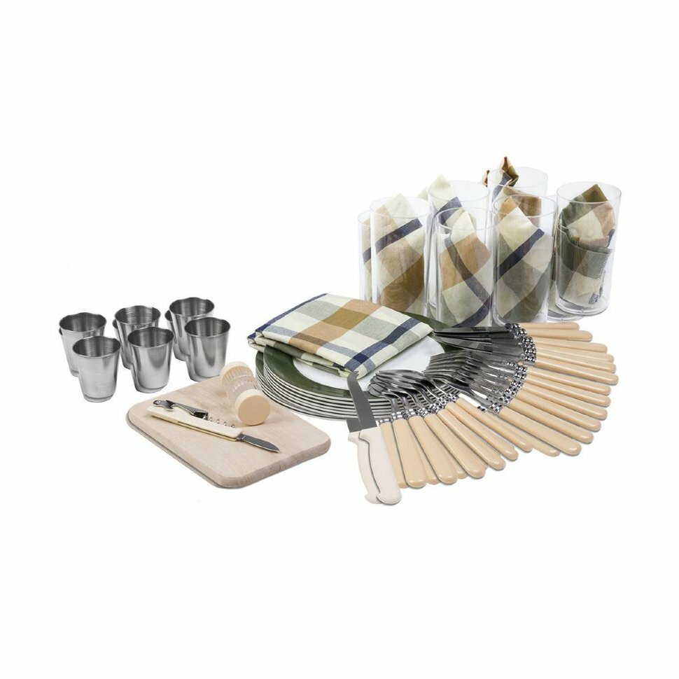 | Комплектация | 6 тарелок; 6 бокалов; 6 стопок; 6 ложек; 6 вилок; 6 ножей; 1 разделочный нож; 1 штопор-открывашка; 1 доска разделочная; 1 солонка; 1 скатерть; 6 салфеток. |