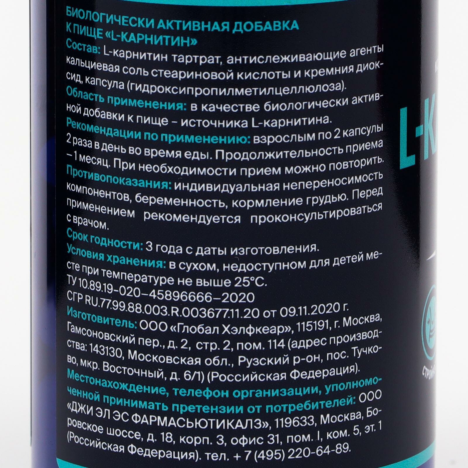 GLS Pharmaceuticals L-Карнитин 800, жиросжигатель для похудения, спортивное питание, 60 капсул по 400 мг