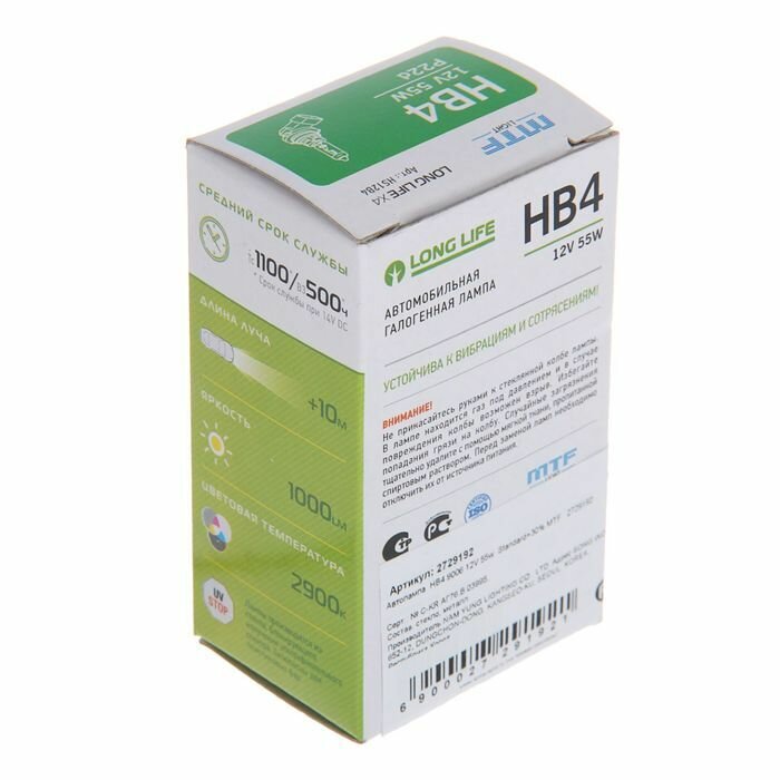 Лампа галоген 12v hb4 55w p22d mtf 9006 longlife standart +30% 2900к