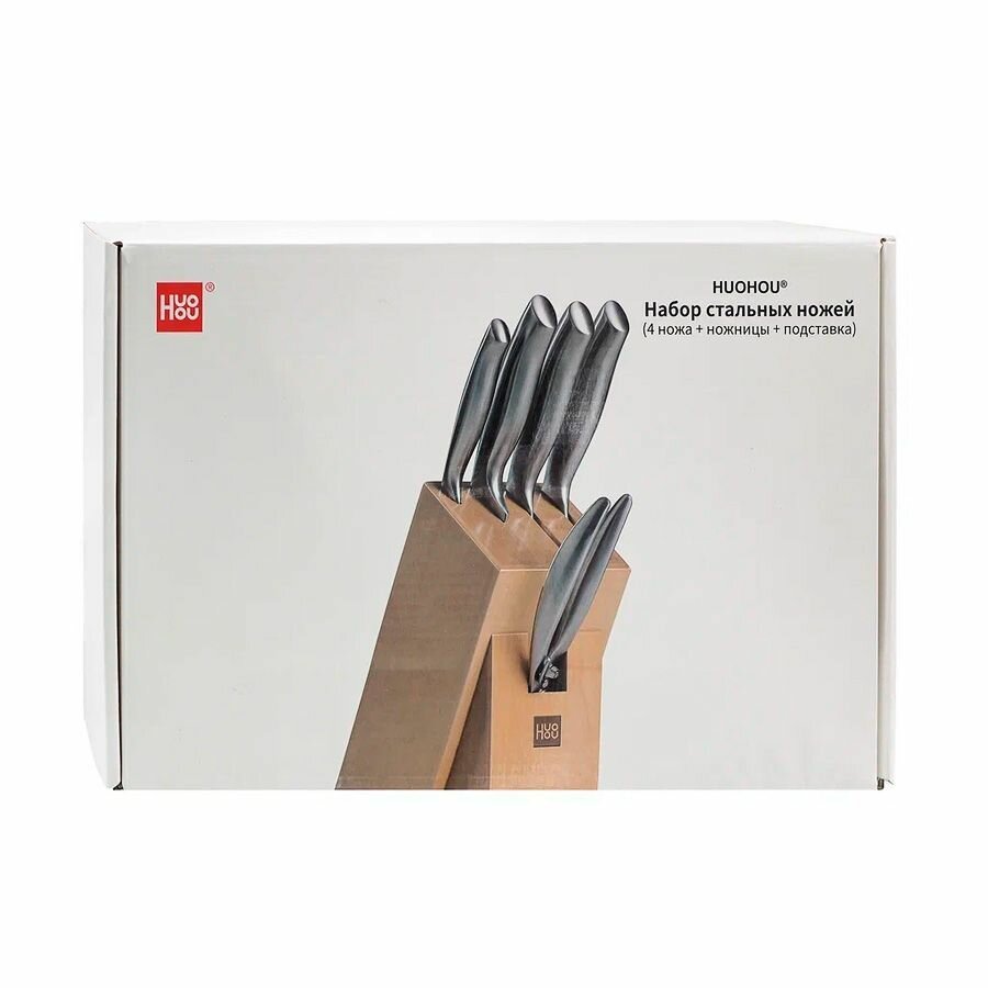 Набор стальных ножей Huohou 6-Piece Stainless Steel Kitchen Knife Set (HU0014), (4 ножа + ножницы + подставка) русская версия!!!, серебристый