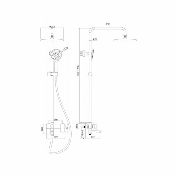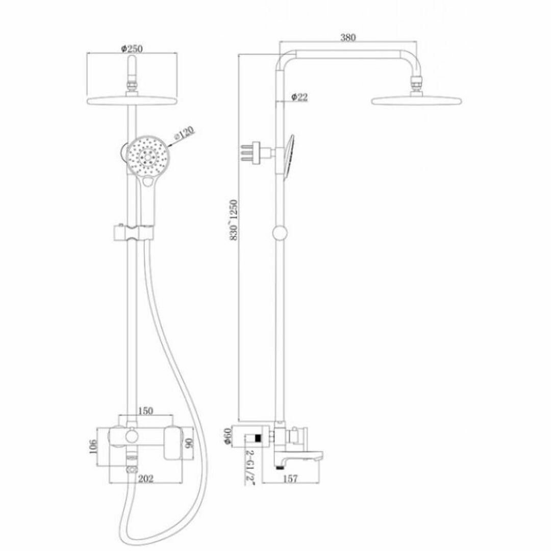 | Дополнительная информация | высота стойки для душа: 1250 мм; диаметр душевой лейки: 120 мм; диаметр верхнего душа: 230 мм |