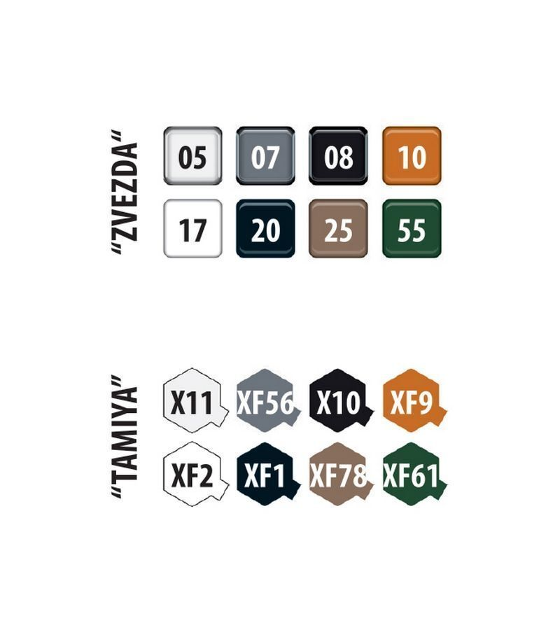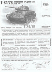 | Дополнительная информация | люки выполнены отдельными деталями; нейлоновая сетка для вентиляционных решёток, нить для имитации буксировочного троса; декаль для 3 вариантов: Т-34 №107 «Сергей Киров» из состава 1-й Ленинградской Краснознаменной танковой бригады, Ленинградский фронт январь-февраль 1943 г., Т-34 №106 «Сталинец» из состава 1-й Ленинградской Краснознаменной танковой бригады, Ленинградский фронт весна 1943 г., Т-34 № 116 «Ленинградец» из состава 1-й Ленинградской Краснознаменной танковой бригады, Красное село, январь 1944 г. |