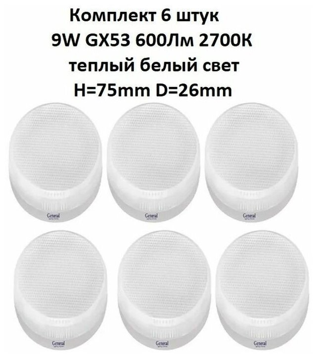 Лампочка светодиодная, General, Комплект из 6 шт., 9 Вт, Цоколь GX53, 2700К, Форма лампы Шайба, GX53