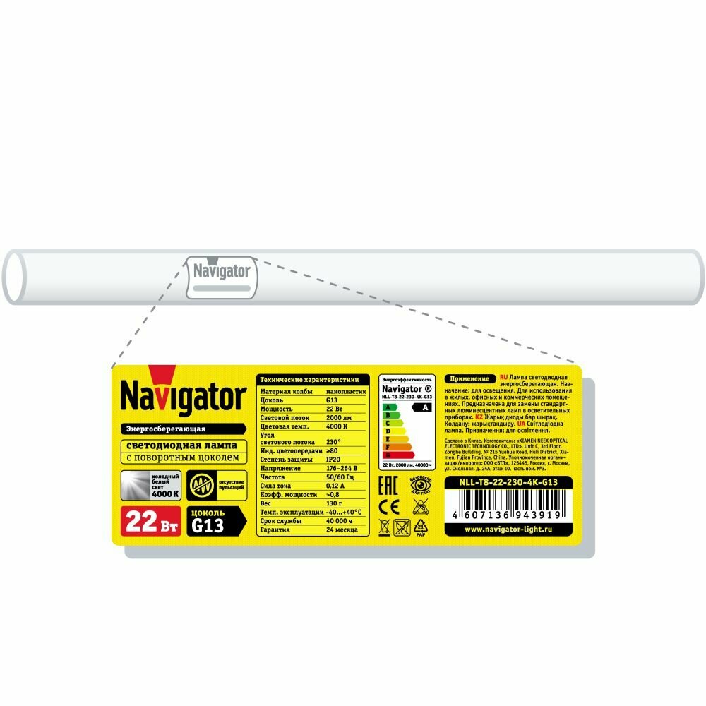 NAVIGATOR Лампа светодиодная 94 391 NLL-T8-22-230-4K-G13 22Вт линейная 4000К нейтр. бел. G13 2000лм 170-260В поворотн. NAVIGATOR 94391