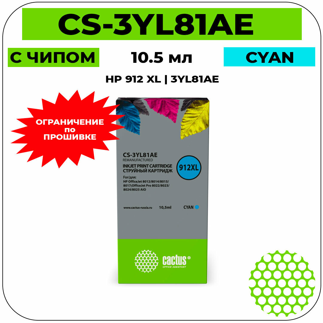 Cactus Картридж струйный 912XL CS-3YL81AE есть ограничения по прошивке голубой 10.5мл для HP OfficeJet 8012 8014 8015 8017;OfficeJet Pro 8022 8023 8024 8025 AIO