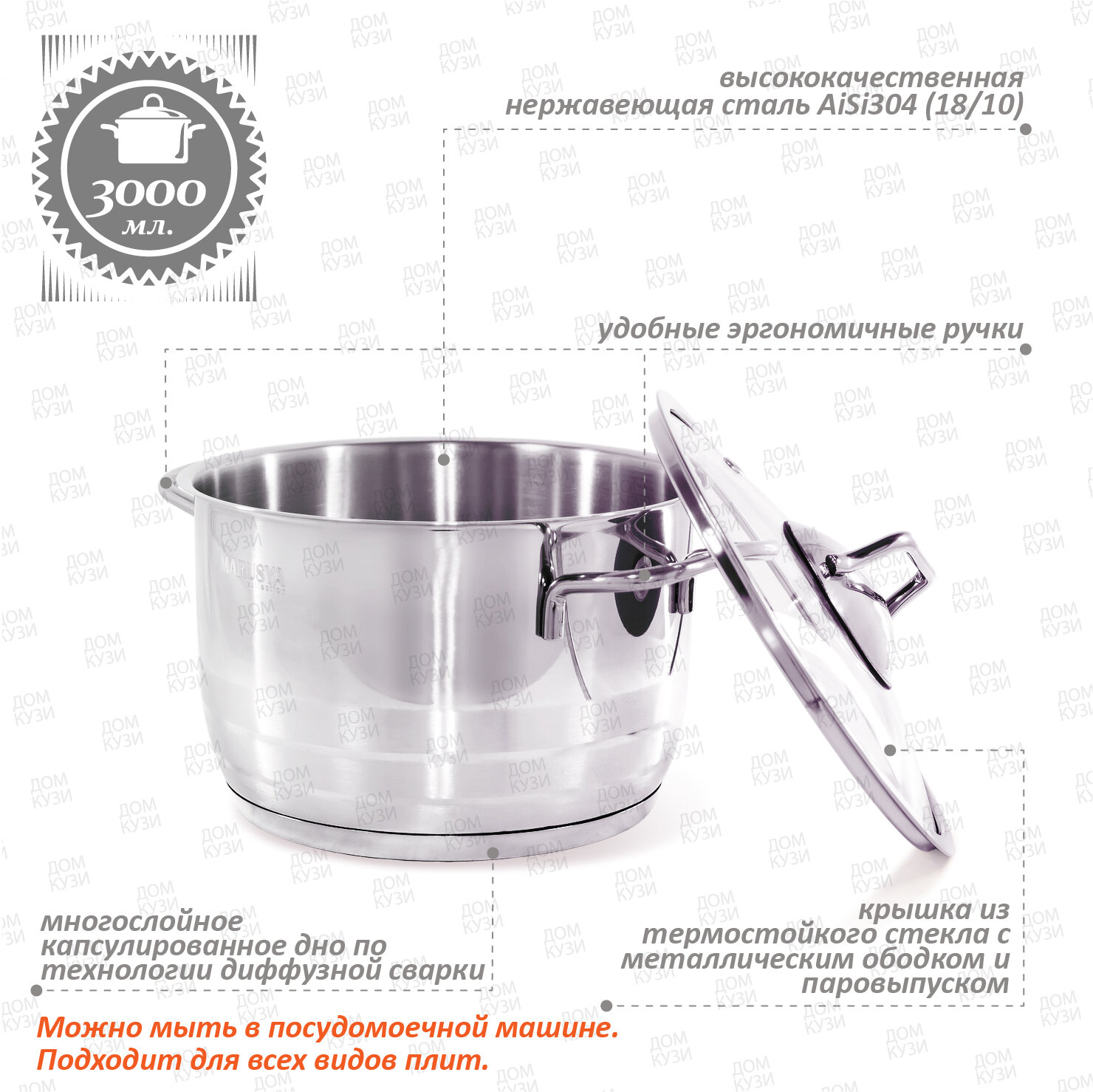 Купить Кастрюля для плиты 3 литра из нержавеющей стали с крышкой Marusya