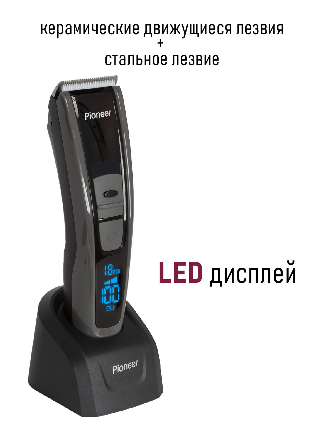 Машинка для стрижки волос Pioneer HC05R со стальным и керамическим движущимся лезвиями, 2 скорости, 7 насадок, работа от аккумулятора