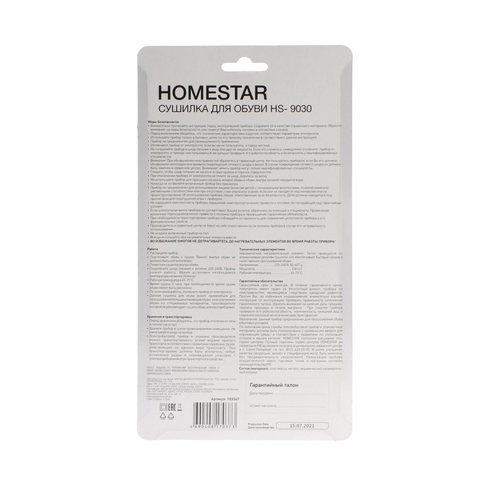 NINGBO JOYFUL INTERNATIONAL CO., LTD Сушилка для обуви Homestar HS-9030, 12 Вт