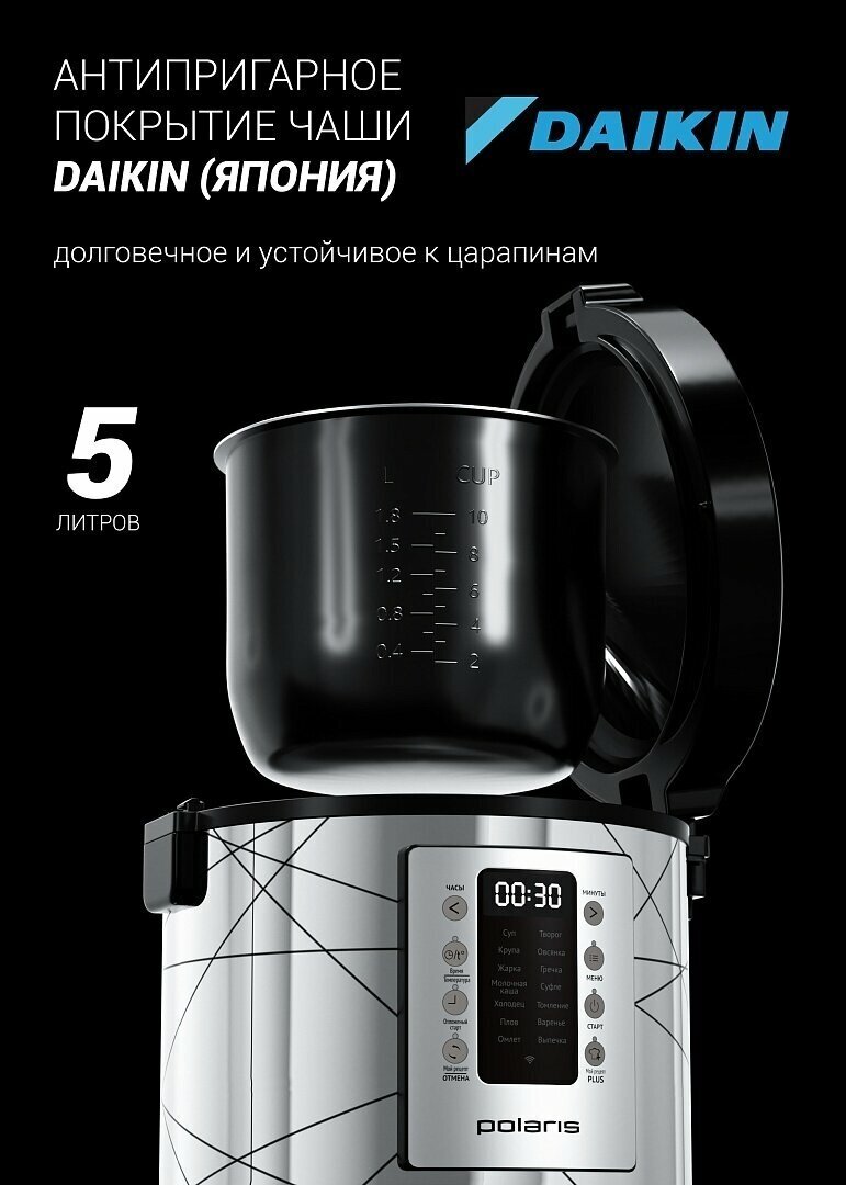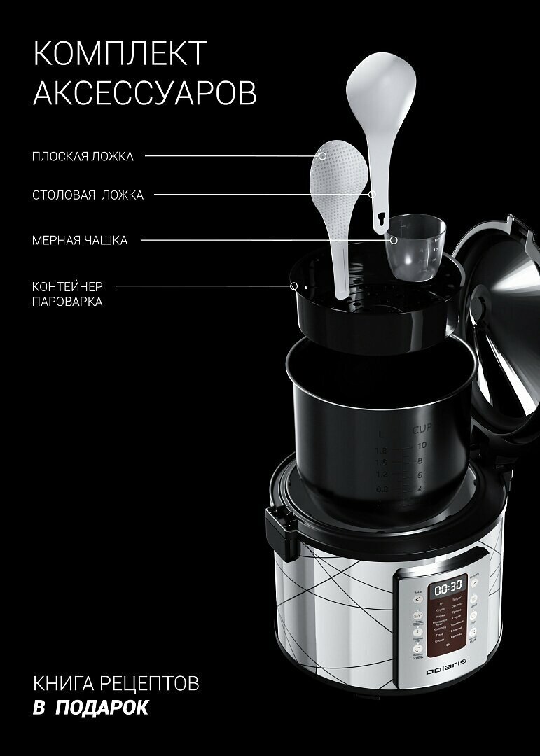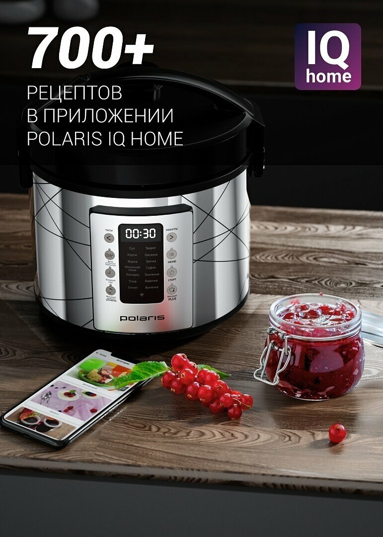 Умная мультиварка Polaris PMC 5020 Wi-Fi IQ Home, антипригарная чаша 5 литров, 45 автопрограмм, 700+ рецептов от шеф-поваров, серебристый