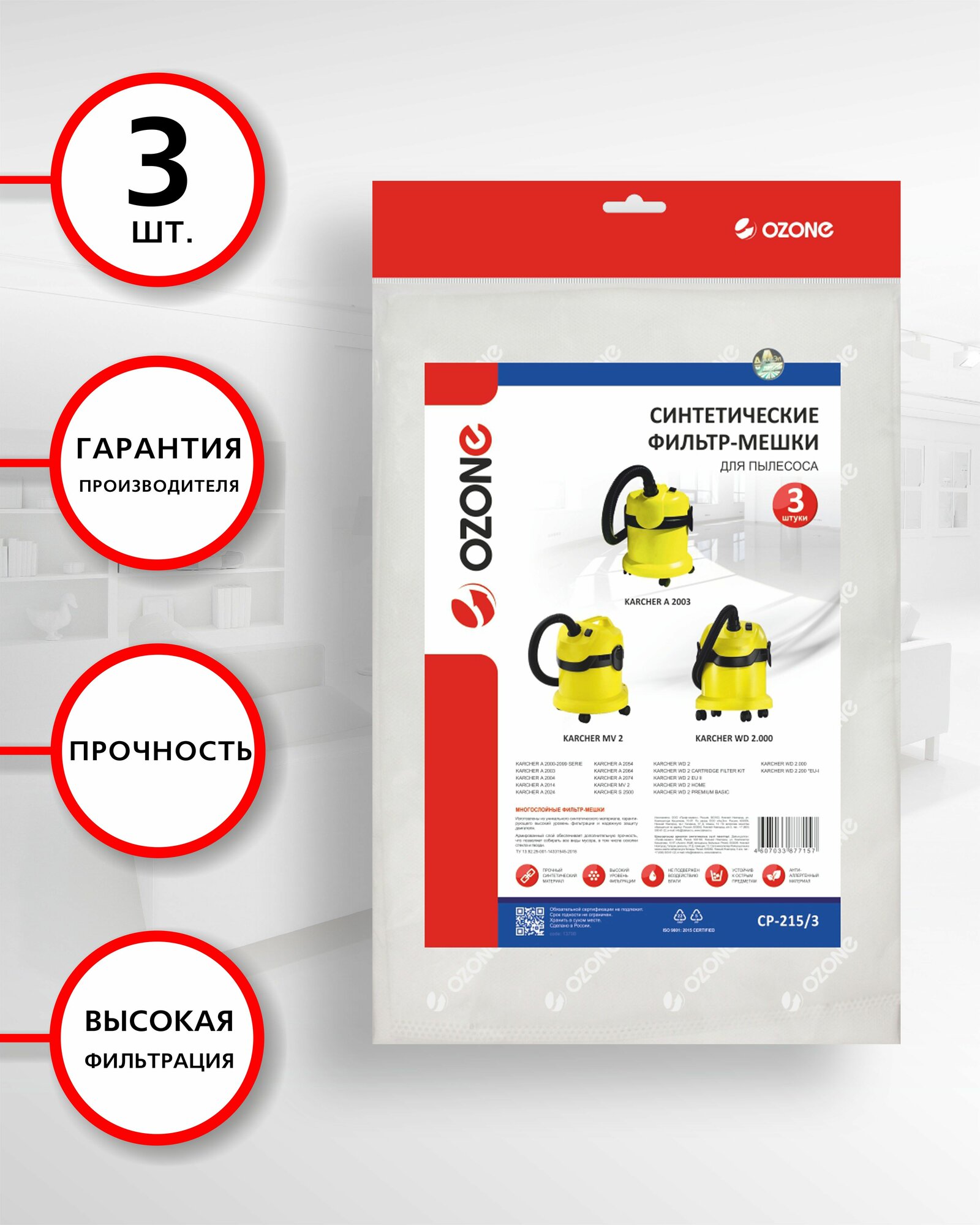 Мешки для пылесоса KARCHER MV 2, WD 2, 3 шт, синтетика, не боятся мокрой пыли, бренд: OZONE, арт. CP-215/3