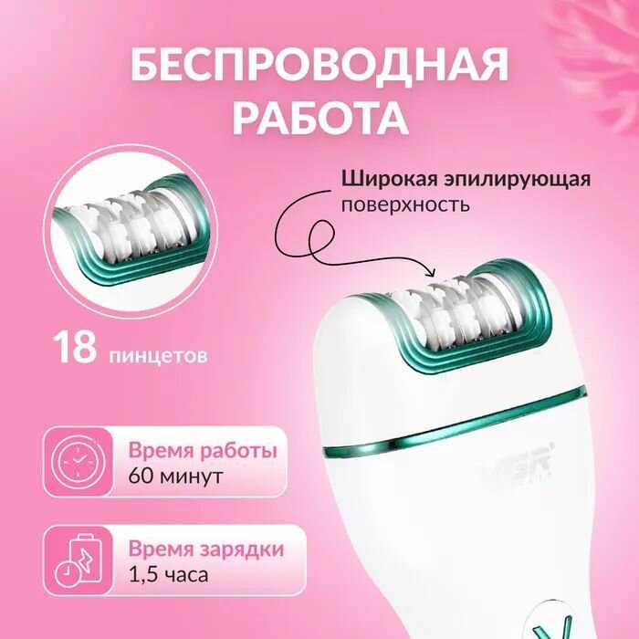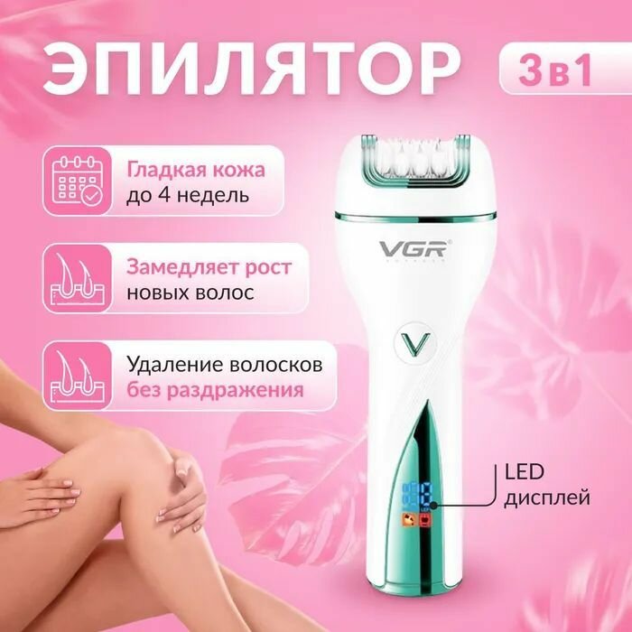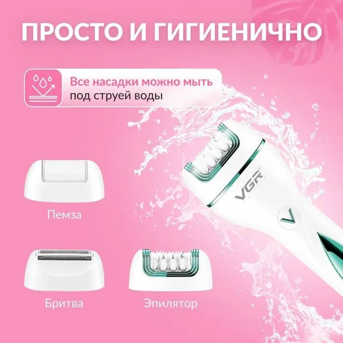 Эпилятор женский 3 в 1 VGR V-728 , 3 сменные насадки: электробритва триммер женский, пемза для ног, эпилятор для удаления волос