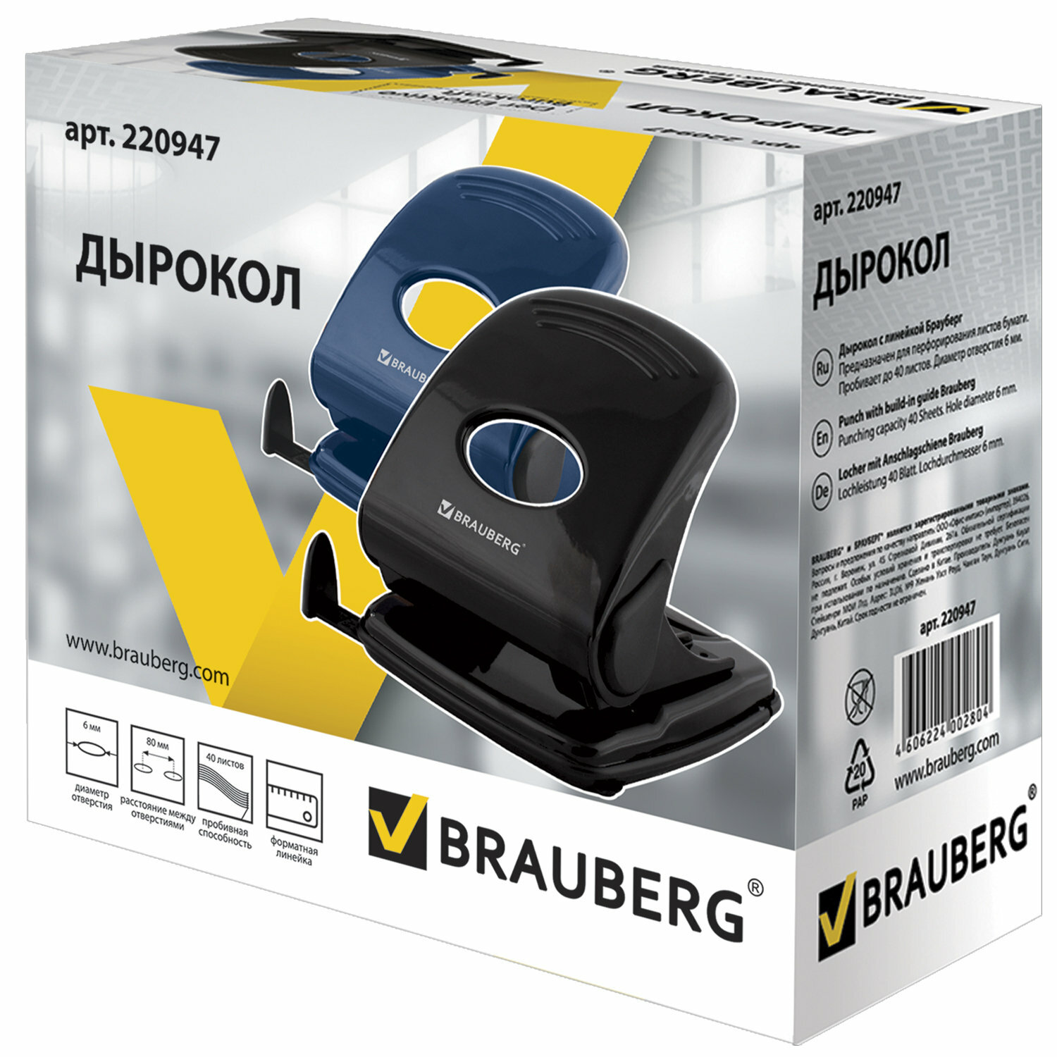 Дырокол металлический BRAUBERG Style, до 40 листов, ассорти (синий/черный), 220947