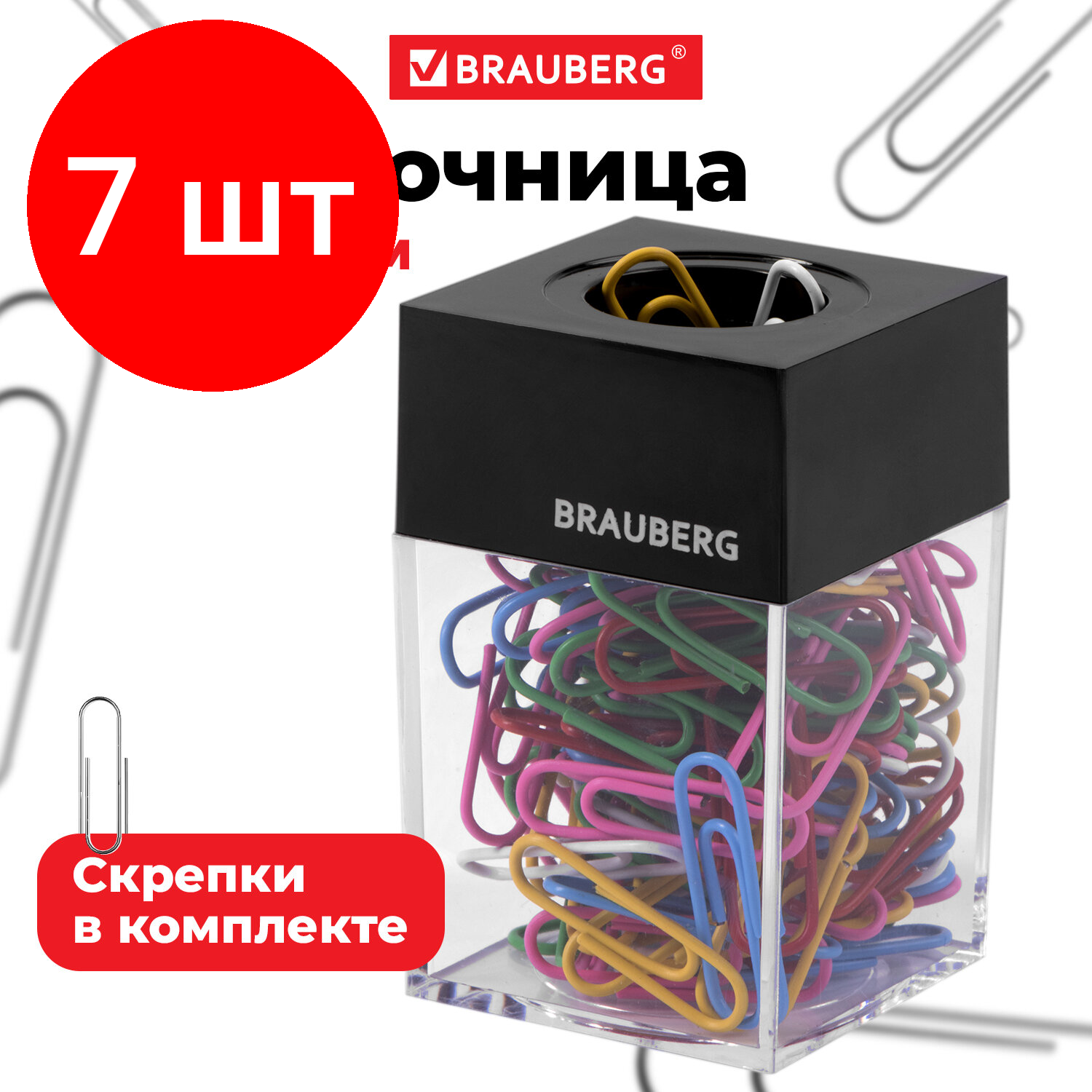 Купить Комплект 7 шт, Скрепочница магнитная BRAUBERG со 100 цветными скрепками 28 мм, прозрачный корпус, 228401