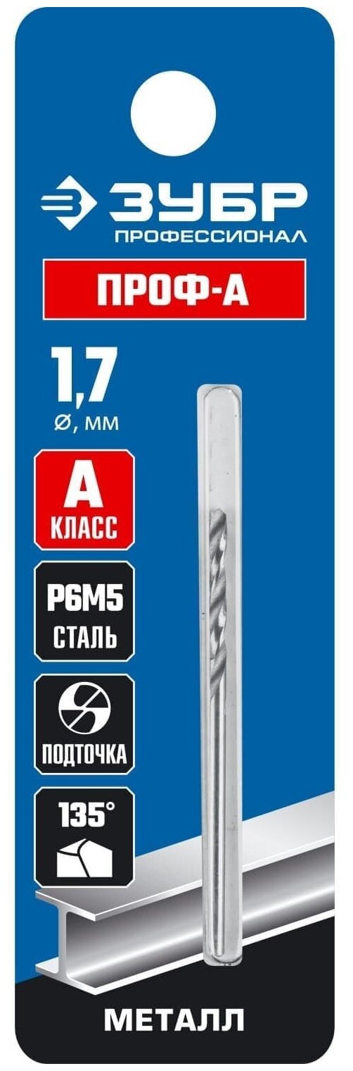ЗУБР Сверло по металлу, Проф-А, класс А, Р6М5, d=1,7 мм, ЗУБР "профессионал"