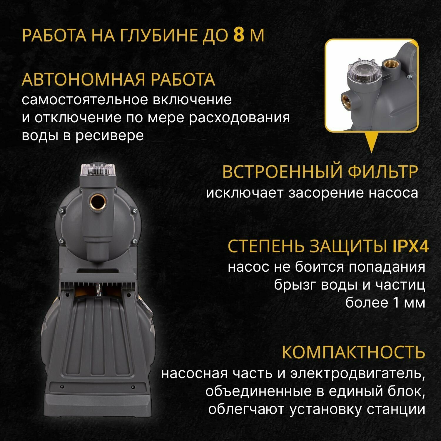 | Плюсы: | практически бесшумный насос.Безотказный как калаш.Качает 12 м без проблем. |