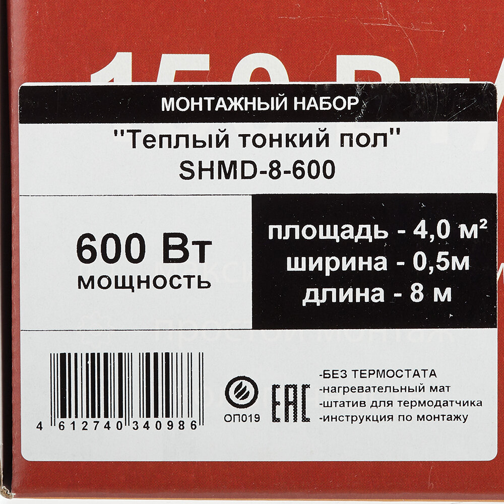 Нагревательный мат (Теплый пол) SpyHeat, Классик SHMD-8-600, 150 Вт/м2, 600 Вт, 4 м2, 800х50 см